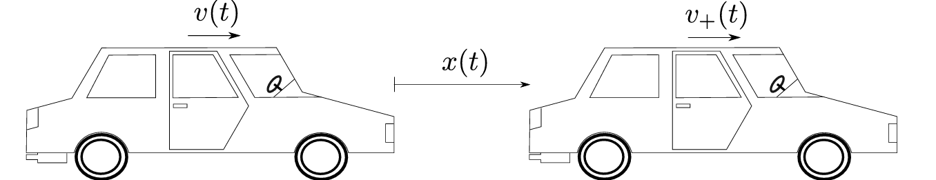 measured in \(\mathrm{m\,s^{-2}}\). Here \(t\) denotes time (measured in \(\mathrm{s}\)), \(b\) and \(c\) are parameters (with units \(\mathrm{s^{-1}}\) and \(\mathrm{s^{-2}}\), respectively), \(v_+(t)>0\) is the speed of the car in front, and \(x_*(t)>0\) is a desired distance to the car in front. We assume that
