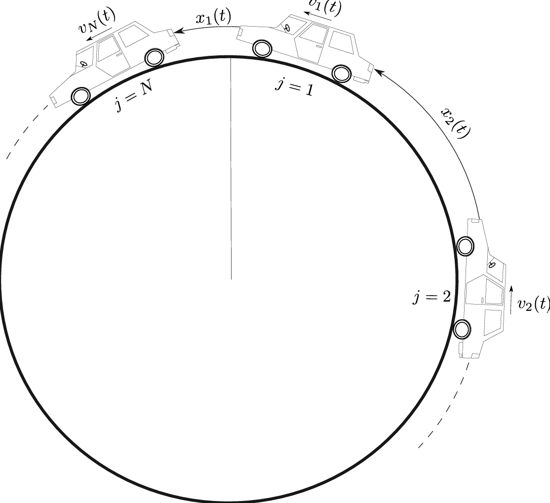 As before, \(v_j(t)\) denotes the speed of car \(j\), while \(x_j(t)\) denotes the (along-the-ring) distance between car \(j-1\) and car \(j\).